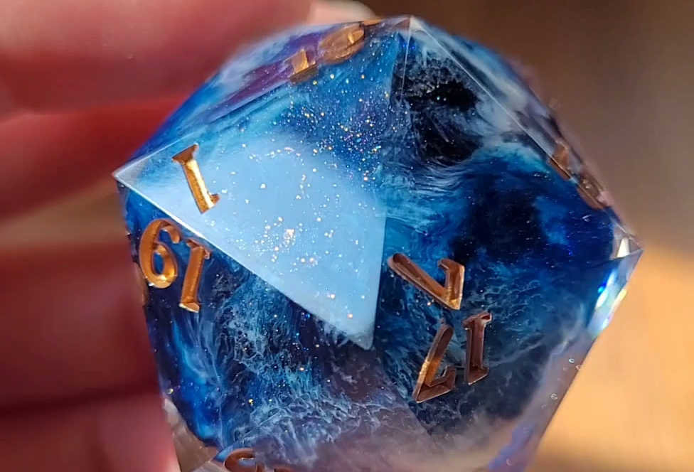 Single double cast 32MM - D20. This D20 was inspired by an image of the city of Velaris I found on Pinterest. It was created using gold, blue, white, and violet pigments.